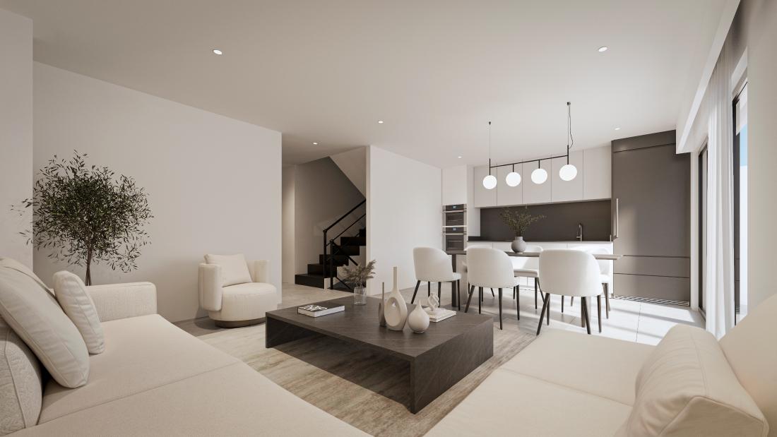 Las viviendas se entregarán con Cocina amueblada con muebles altos y bajos y encimera coverlam, Cocina equipada con fregadero, vitrocerámica, horno y campana extractora, Dormitorio principal con baño en suite y vestidor, Suelos de porcelánico de gran formato, Carpintería exterior de aluminio con rotura de puente térmico, Preinstalación de aire acondicionado por conductos, Preinstalación de Energía Fotovoltaica, Preinstalación de Cargador de vehículo eléctrico, Videoportero digita y Motorización de puerta de vehículos.